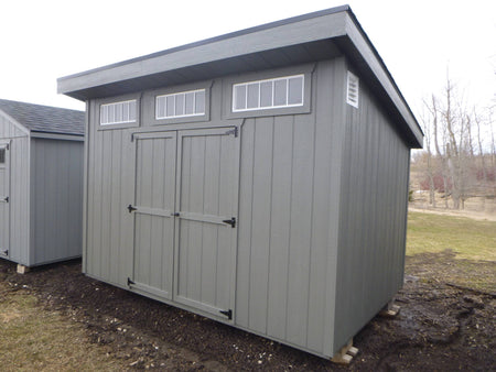 The 8x12 Single Slope Shed features a clean architectural design with a slanted roofline that gives it a contemporary edge and efficient water runoff. Its simple profile fits seamlessly into any backyard while offering generous storage space for tools, equipment, and seasonal items.
